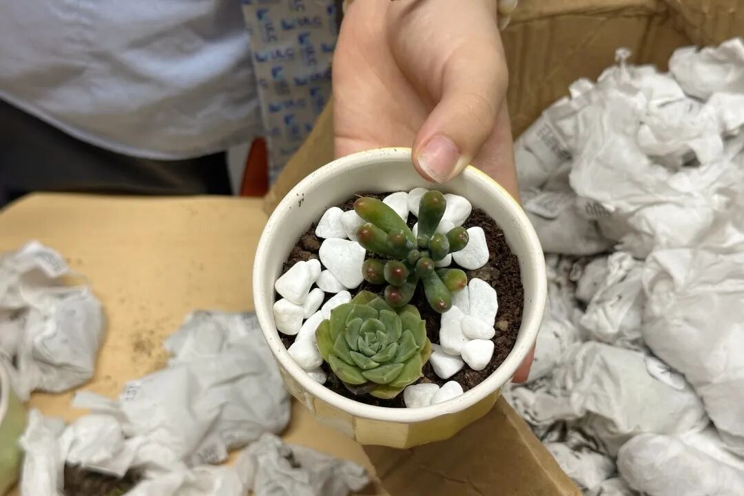 为了给老师们带来惊喜,志愿者协会的同学们亲手栽种多肉绿植,前一晚悄悄放在每位老师的工位上,并写下教师节寄语。